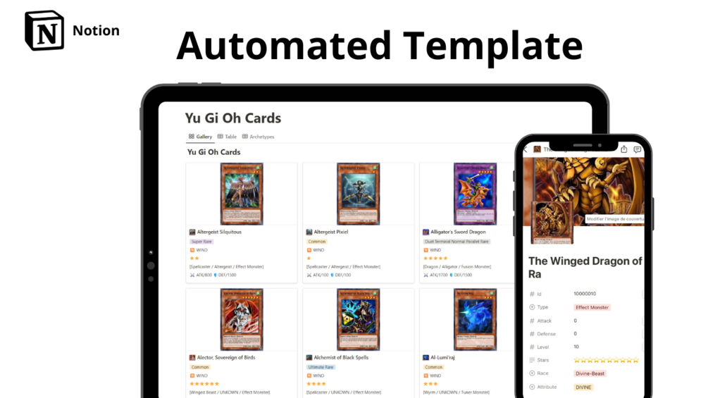 If you are a fan of Yu-Gi-Oh and duel cards game, this template is for you. I automated the update of cards thanks to the Yu-Gi-Oh Pro Deck API.